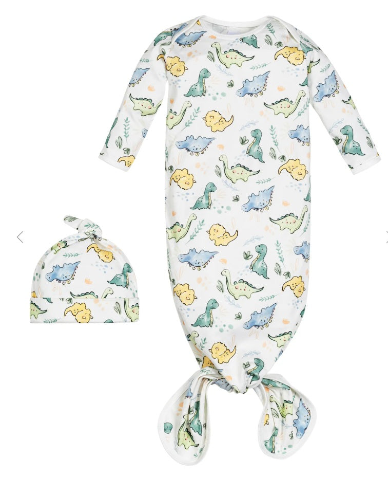 Celebrate the newest little explorer with our adorable Dino Baby Gift Set, designed for comfort and adventure and made from the finest certified organic Egyptian cotton! Featuring a playful dinosaur print, this charming set includes a cozy knotted gown (0-3m) for easy diaper changes and a matching beanie to complete their dino-mite look. The generously sized baby blanket also boasts the fun dinosaur print, perfect for swaddling, tummy time, or snuggles, while the soft puppy lovey toy is waiting to become your baby's new best friend, offering comfort and companionship. This delightful Dino Baby Gift Set is the perfect way to welcome any tiny adventurer to the world, making it an unforgettable gift for baby showers, new arrivals, or just because.