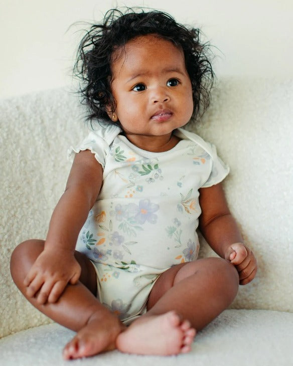 Bring a little sunshine to everyday dressing with our Organic Egyptian Cotton Baby Bodysuit featuring sweet flutter sleeves and a cheerful modern daisy print.
