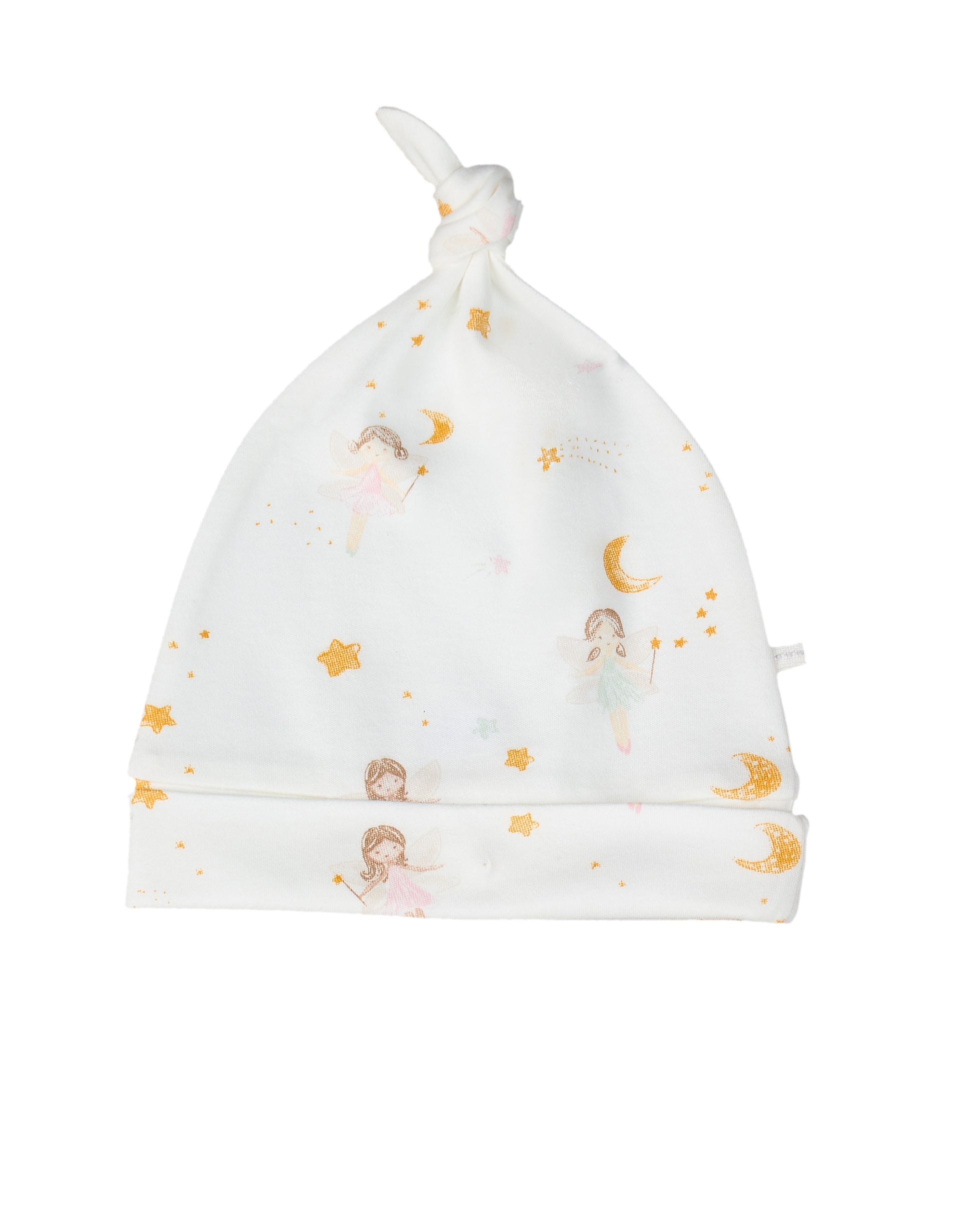 Designed to gently hug baby’s head, this adorable hat is crafted from GOTS-certified organic cotton grown along the banks of the Nile — breathable, hypoallergenic, and perfect for sensitive newborn skin. The sweet fairy pattern adds a whimsical touch, while the adjustable knot ensures the perfect fit as your baby grows.